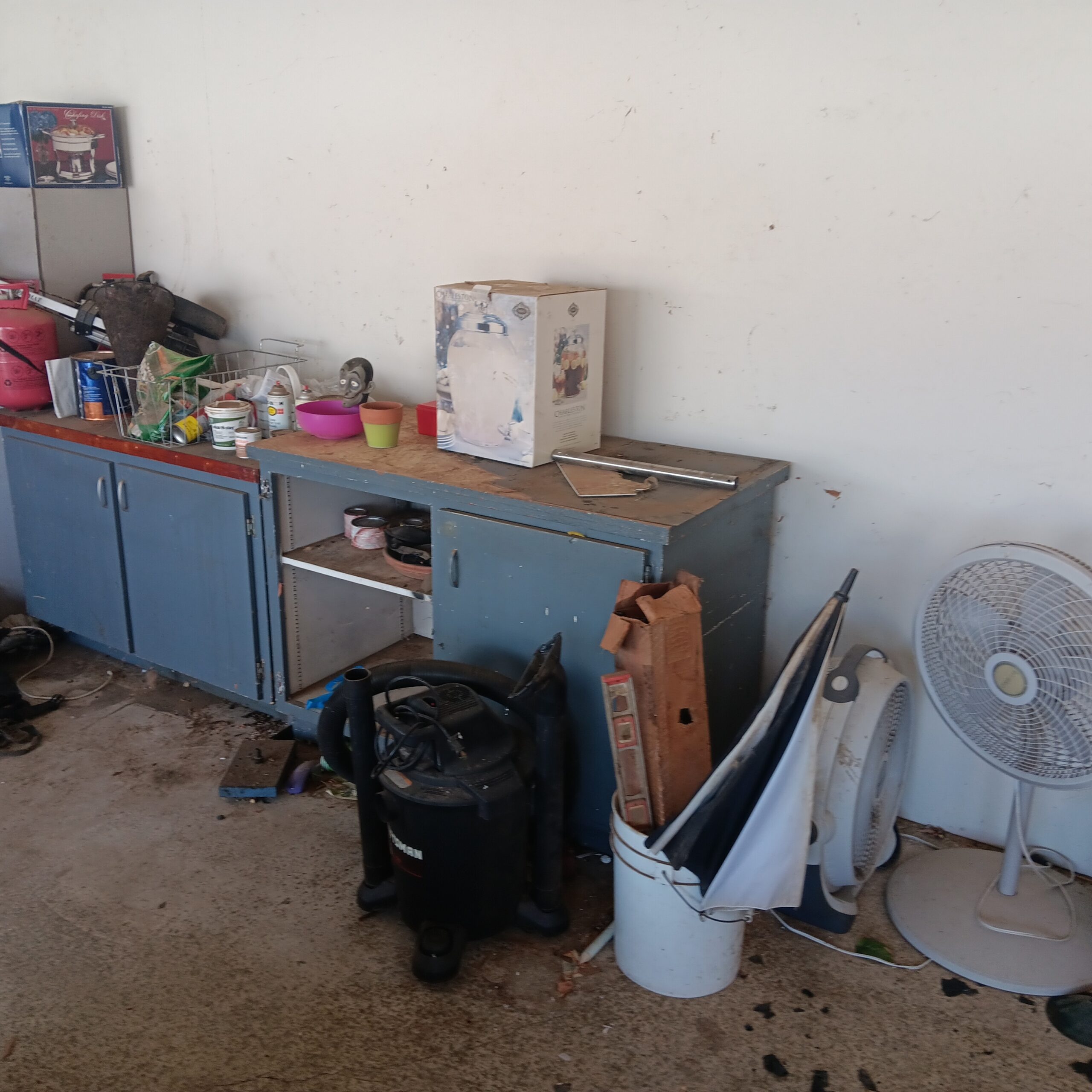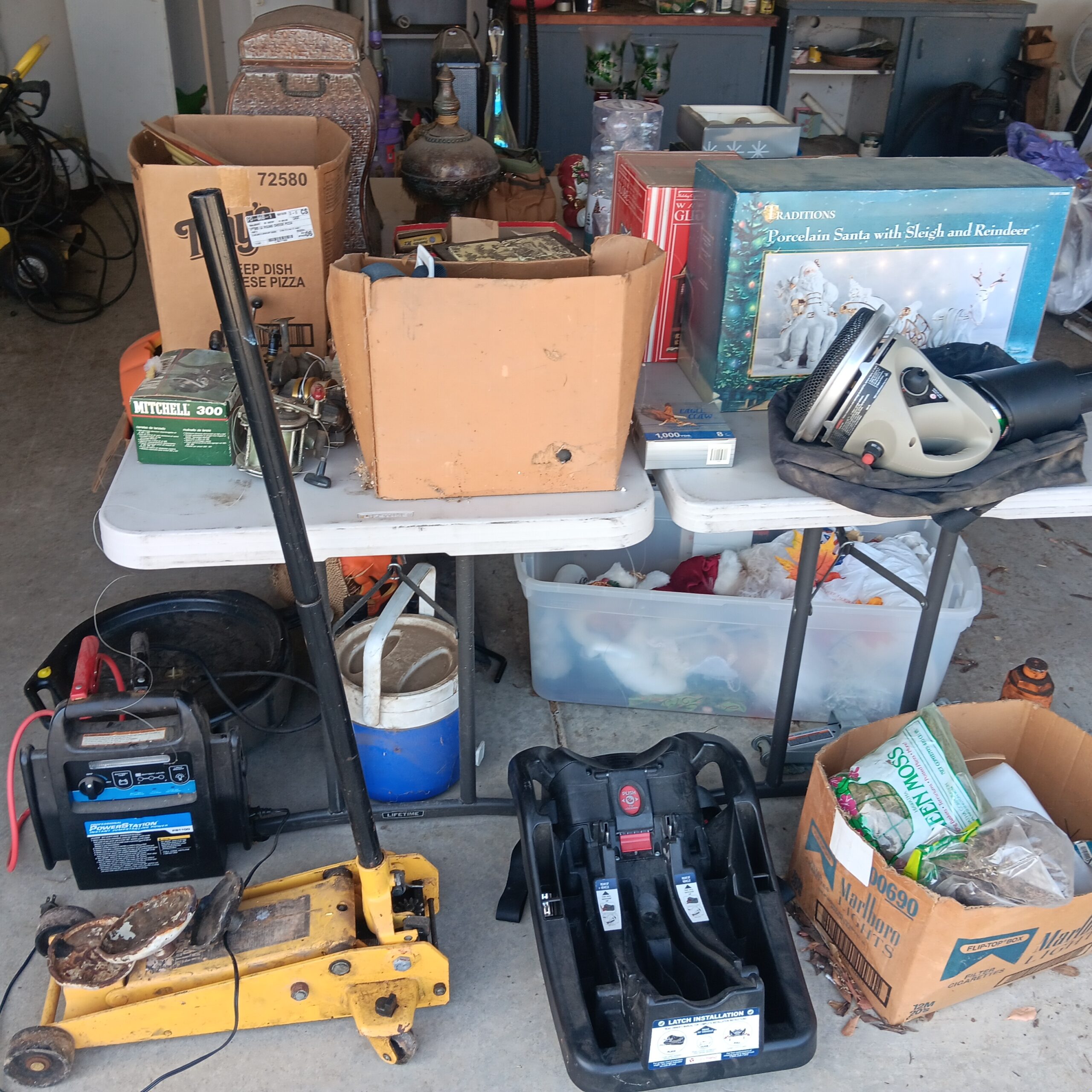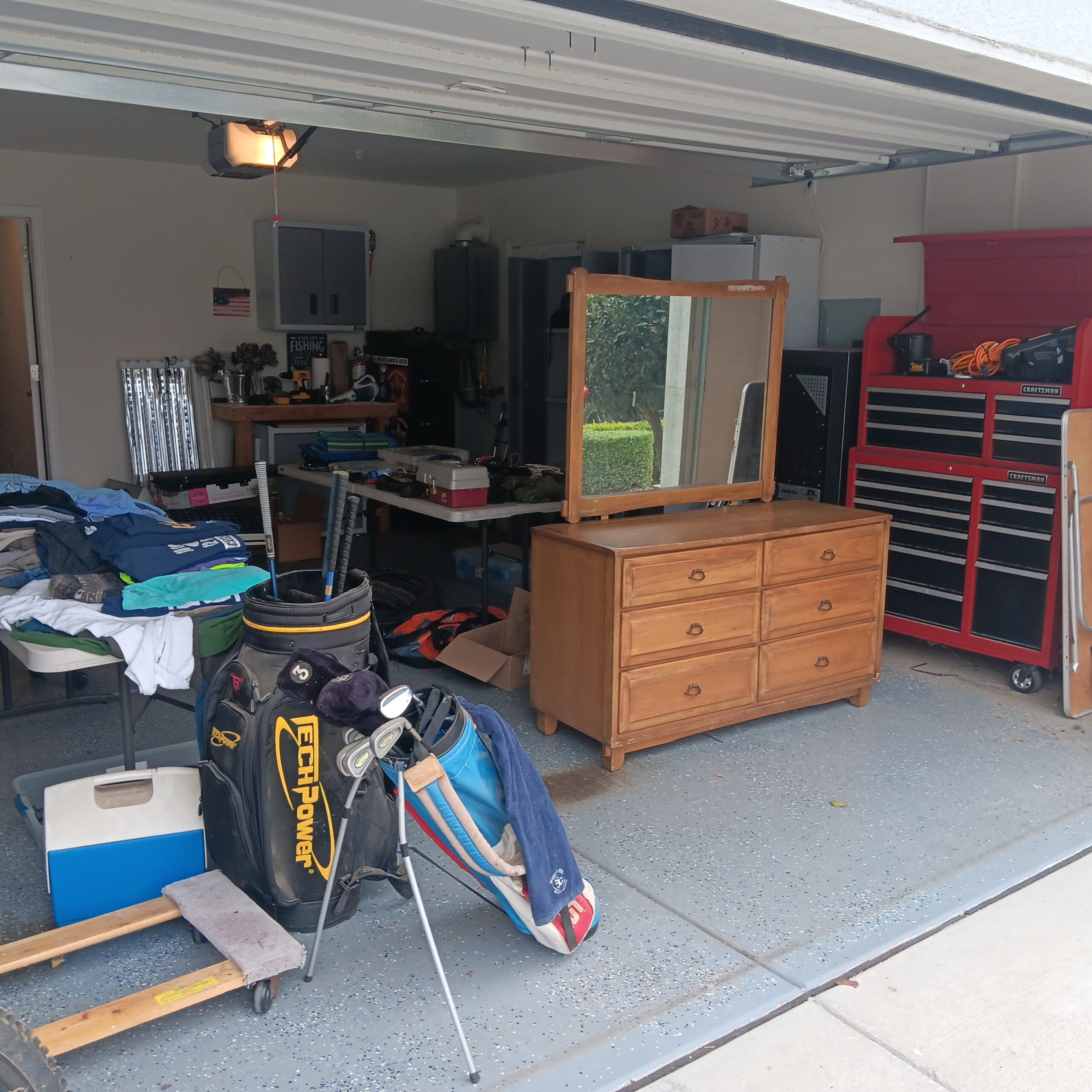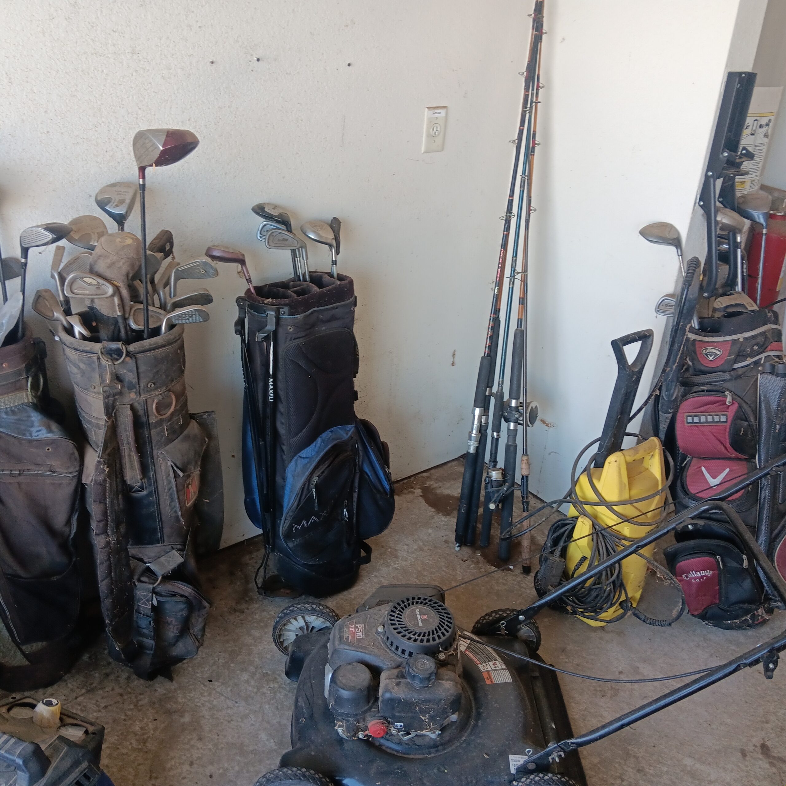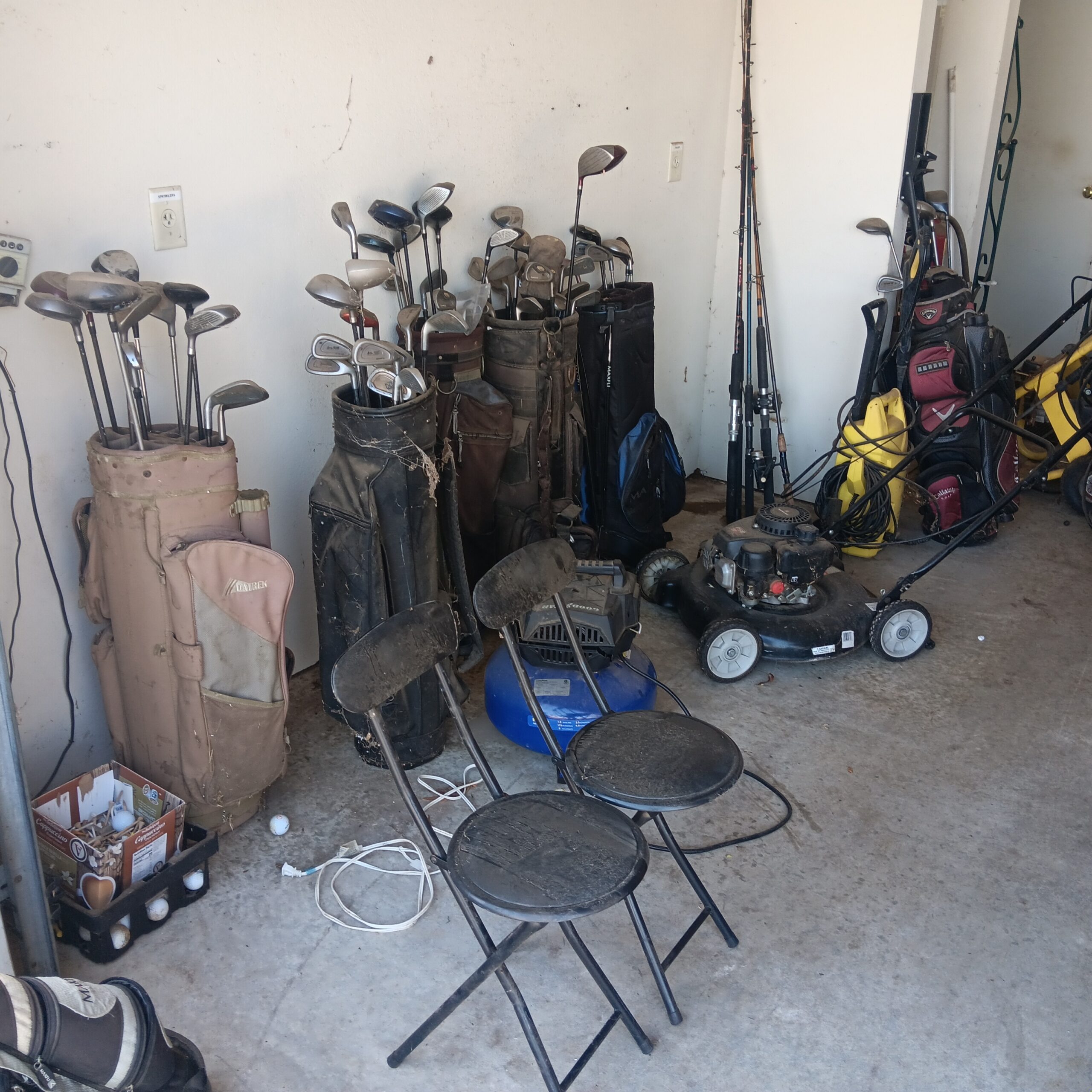 Lots of Golf clubs and golf bags, lawn mower, edger, pressure washer, Fishing gear, patio furniture, home furnishing, kitchen ware, Samsung refrigerator, large fountain, lots of women’s clothes in great / new condition, curved glass curio, upright piano, shelving, cabinets, crystal, and lots of fun stuff to dig through!