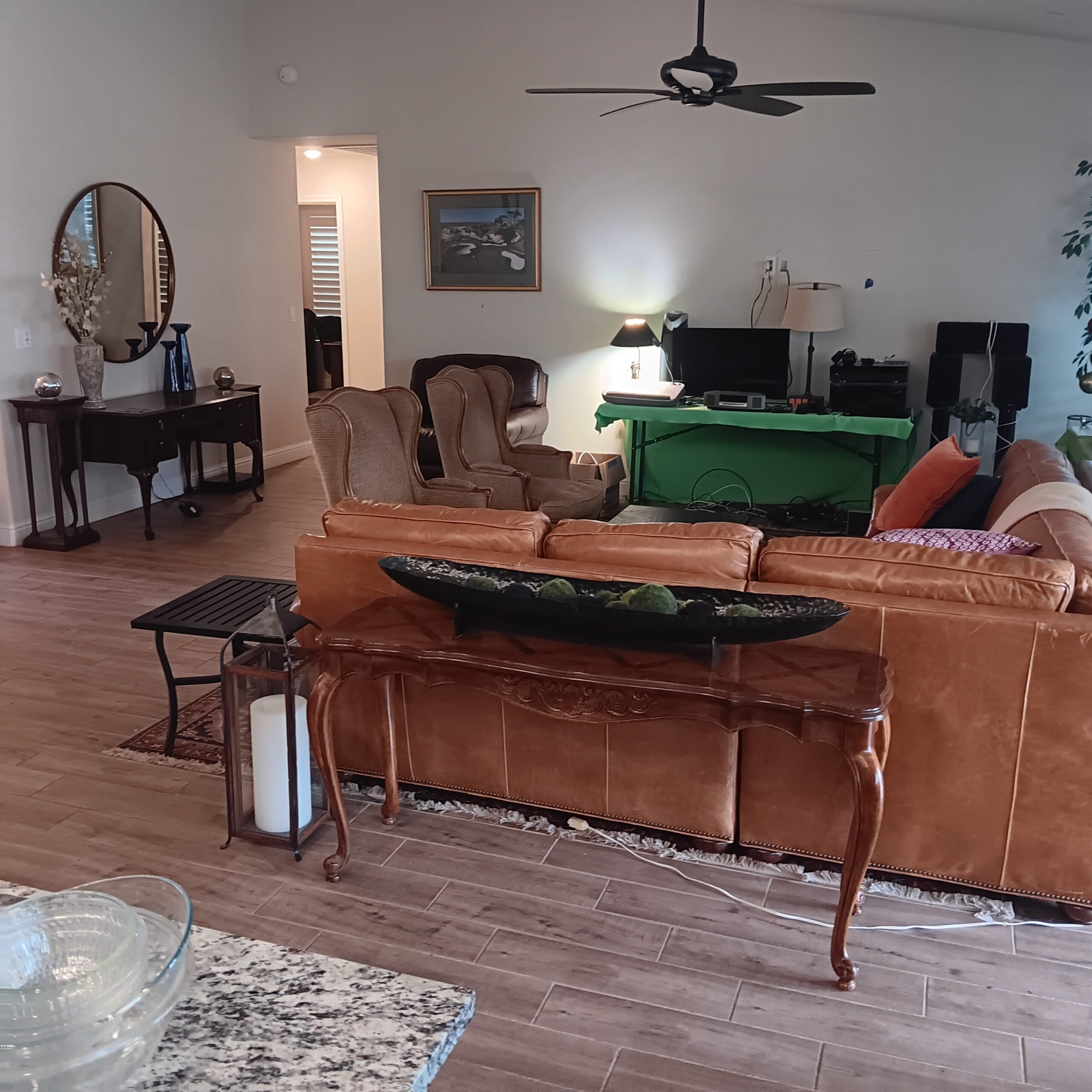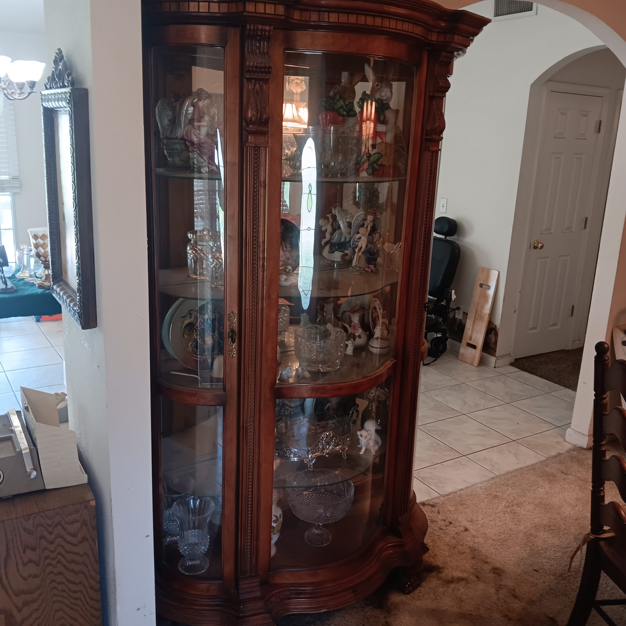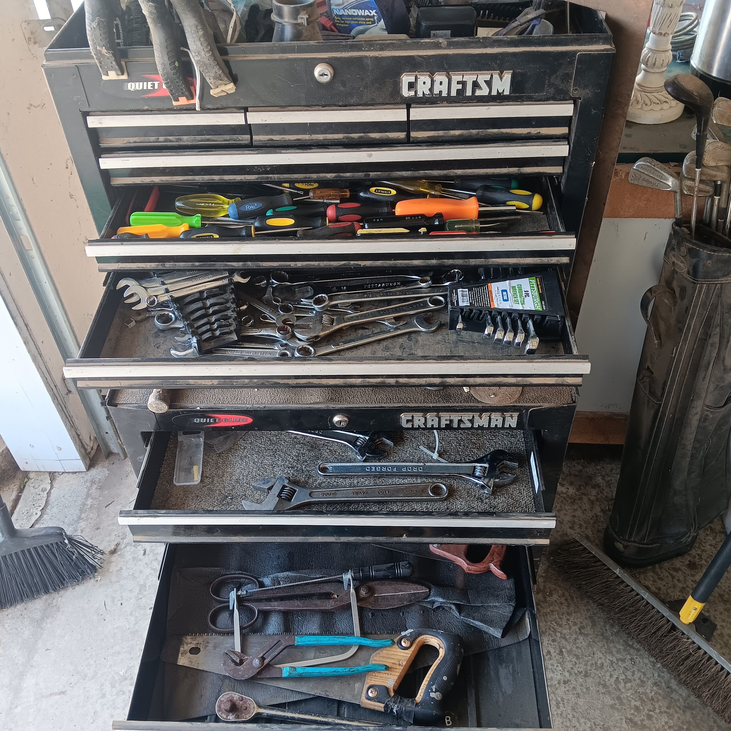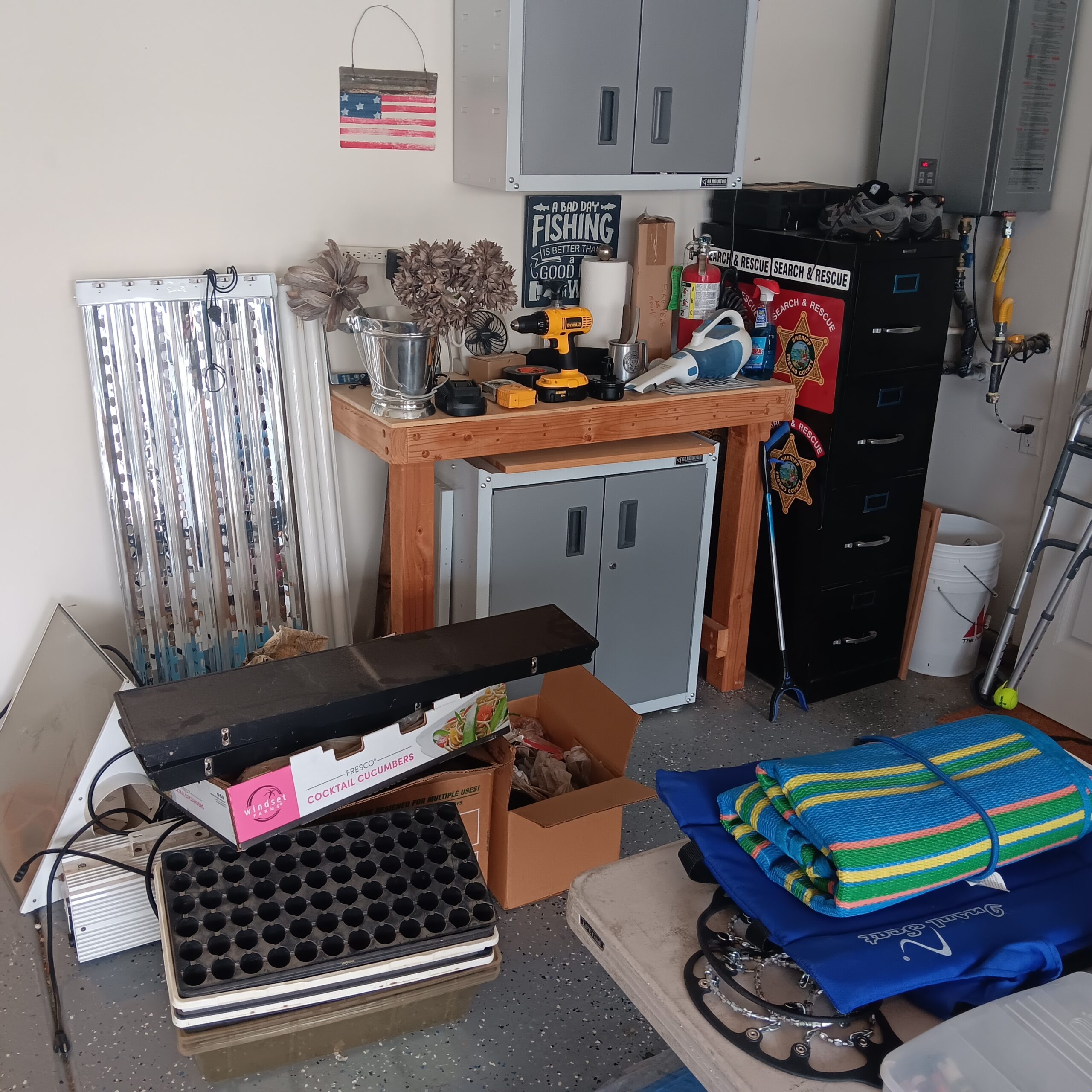 Lots of Golf clubs and golf bags, lawn mower, edger, pressure washer, Fishing gear, patio furniture, home furnishing, kitchen ware, Samsung refrigerator, large fountain, lots of women’s clothes in great / new condition, curved glass curio, upright piano, shelving, cabinets, crystal, and lots of fun stuff to dig through!