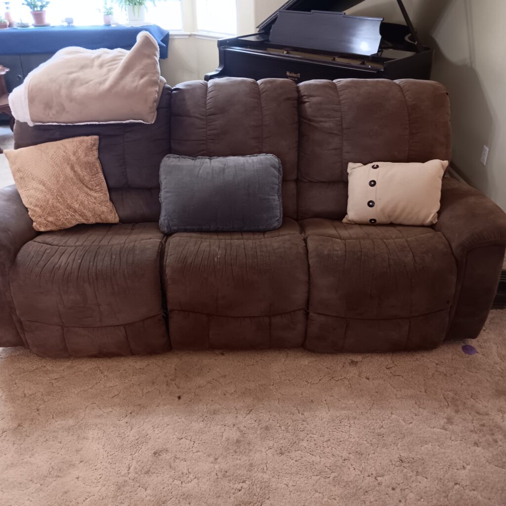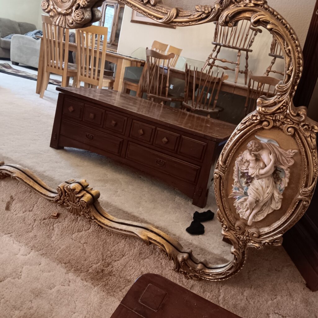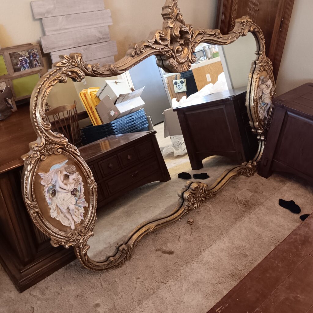 Couch, coffee table, Huge Antique mirror