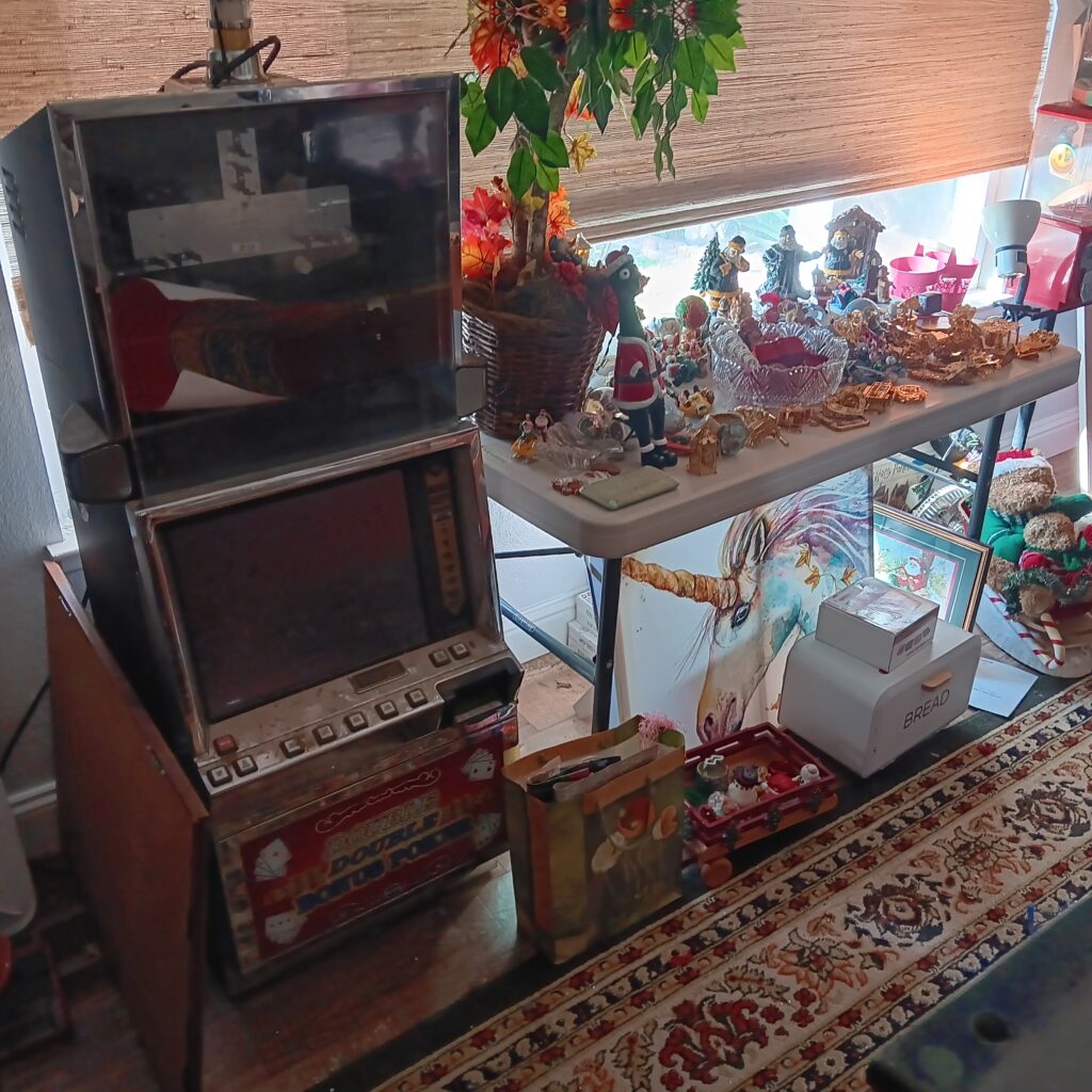 In the house we have an amazing assortment of Christmas decor, sports memorabilia including signed jerseys by Terry Bradshaw and mean Joe Greene, Emmett Kelly clowns ,Hummel figurines, and even a slot machine (needs a little work though).