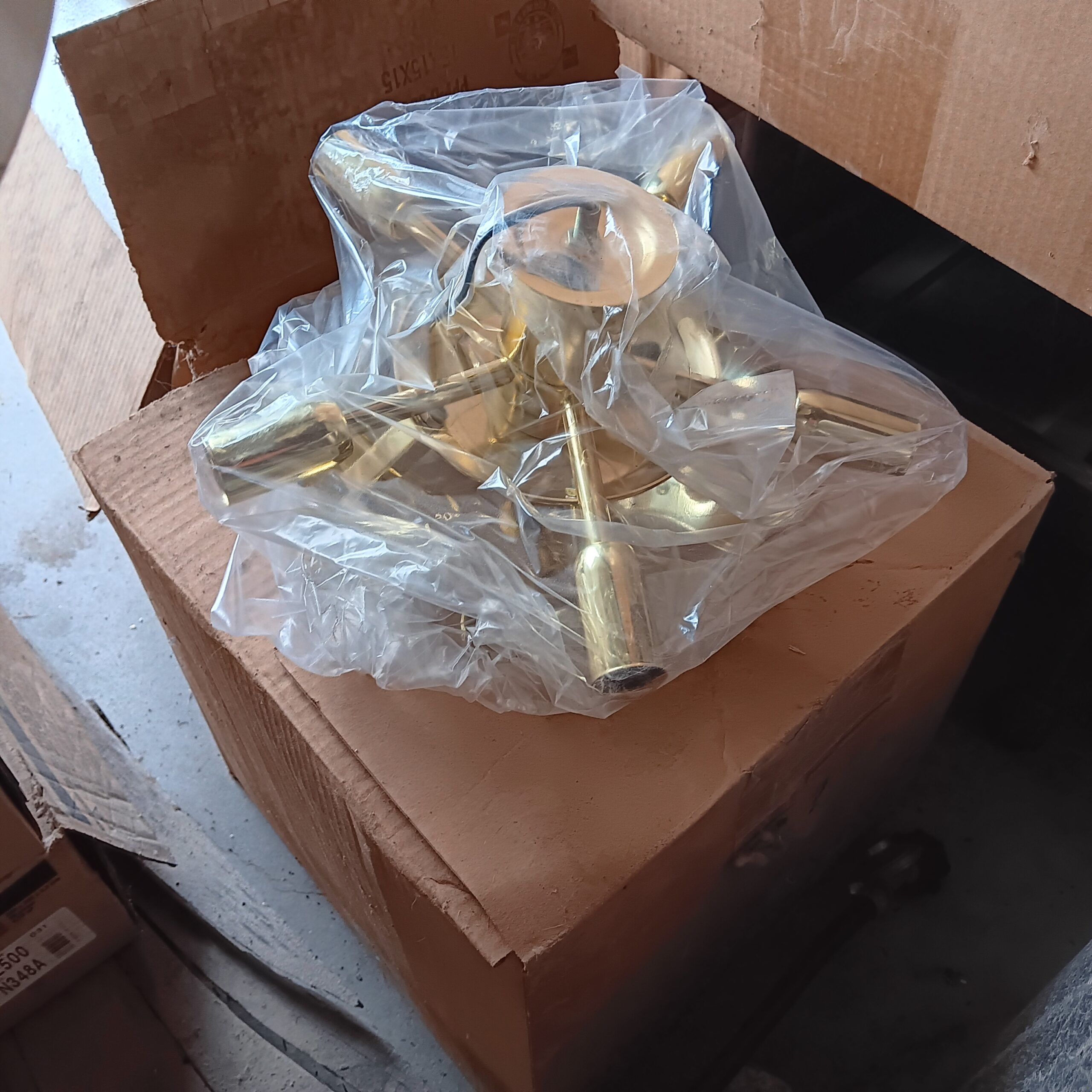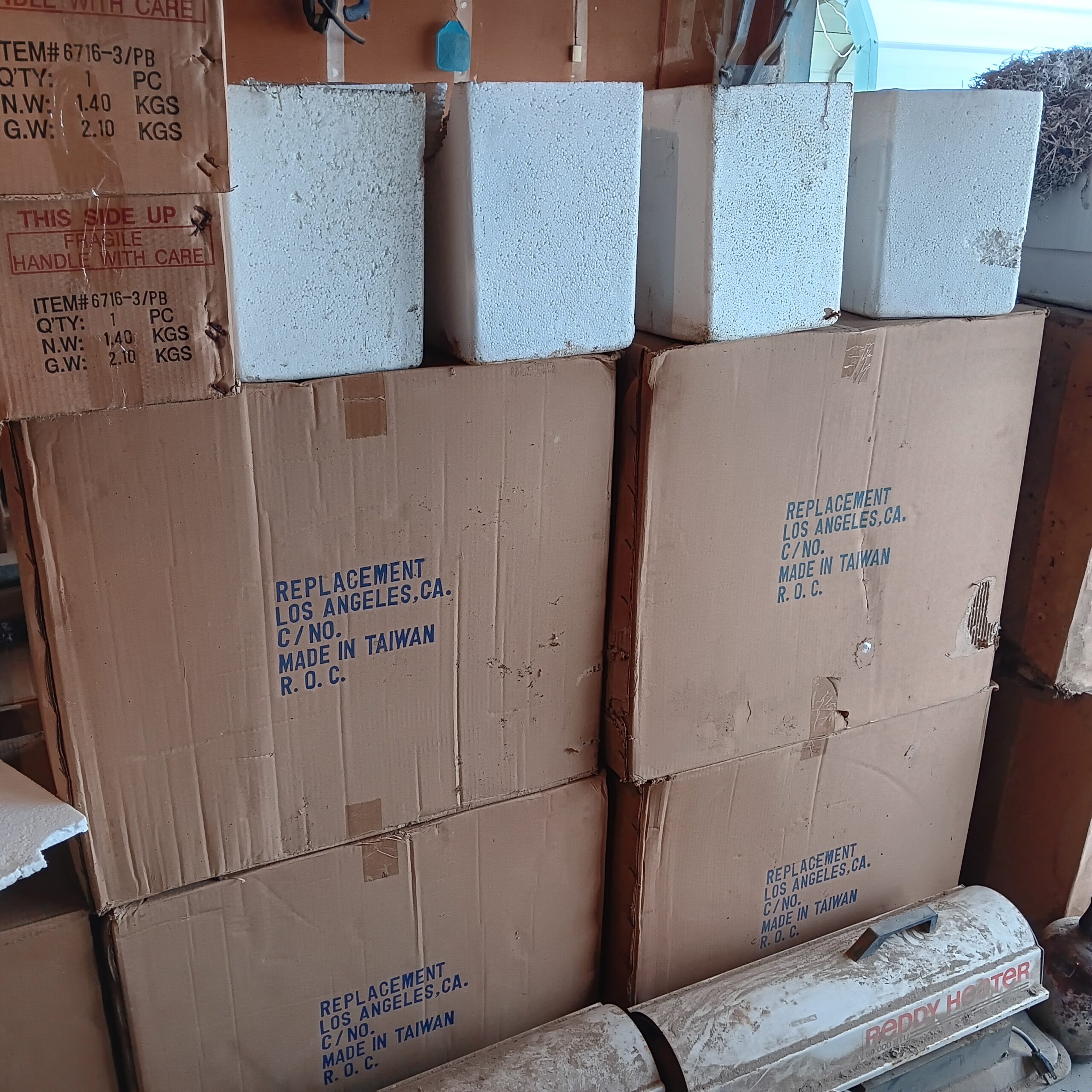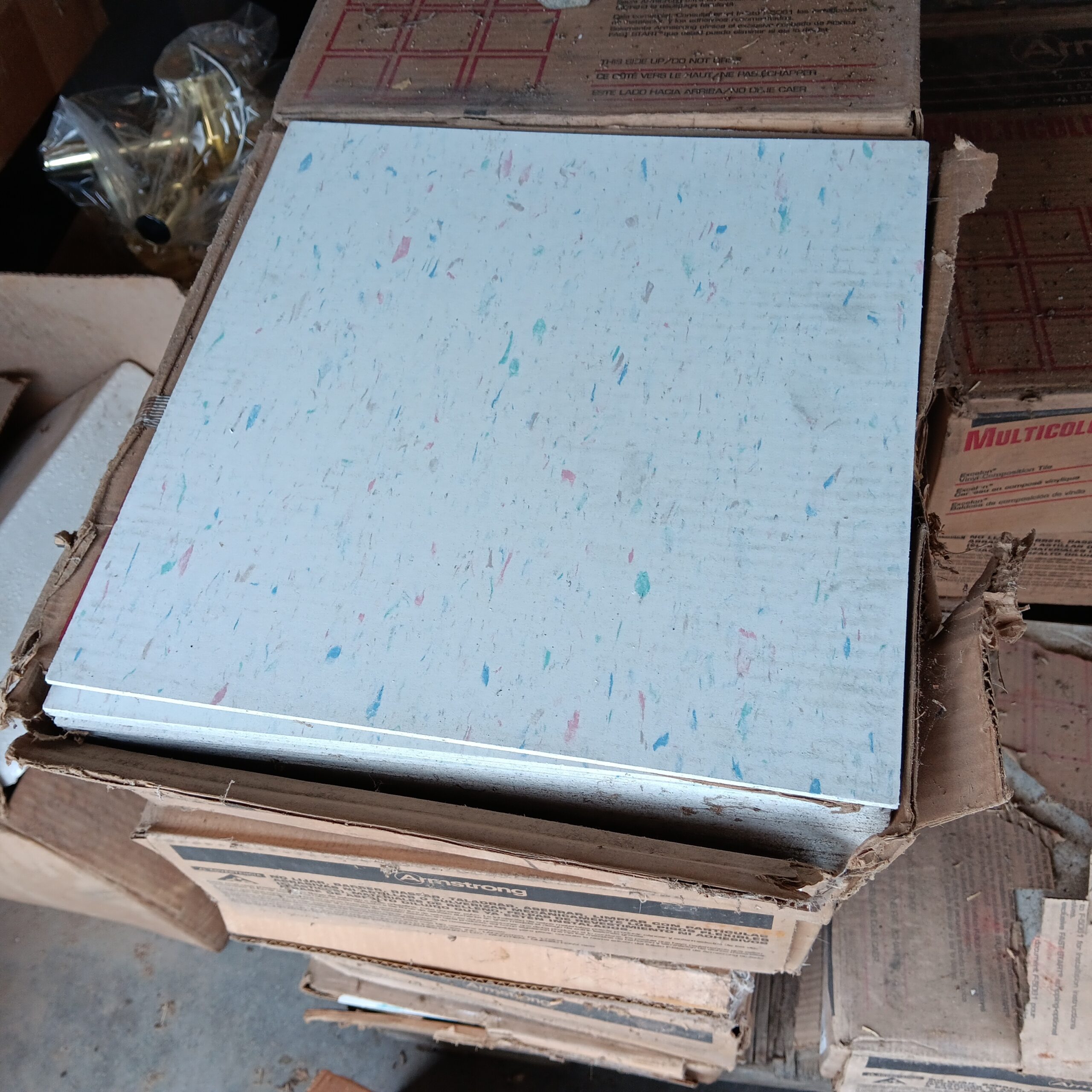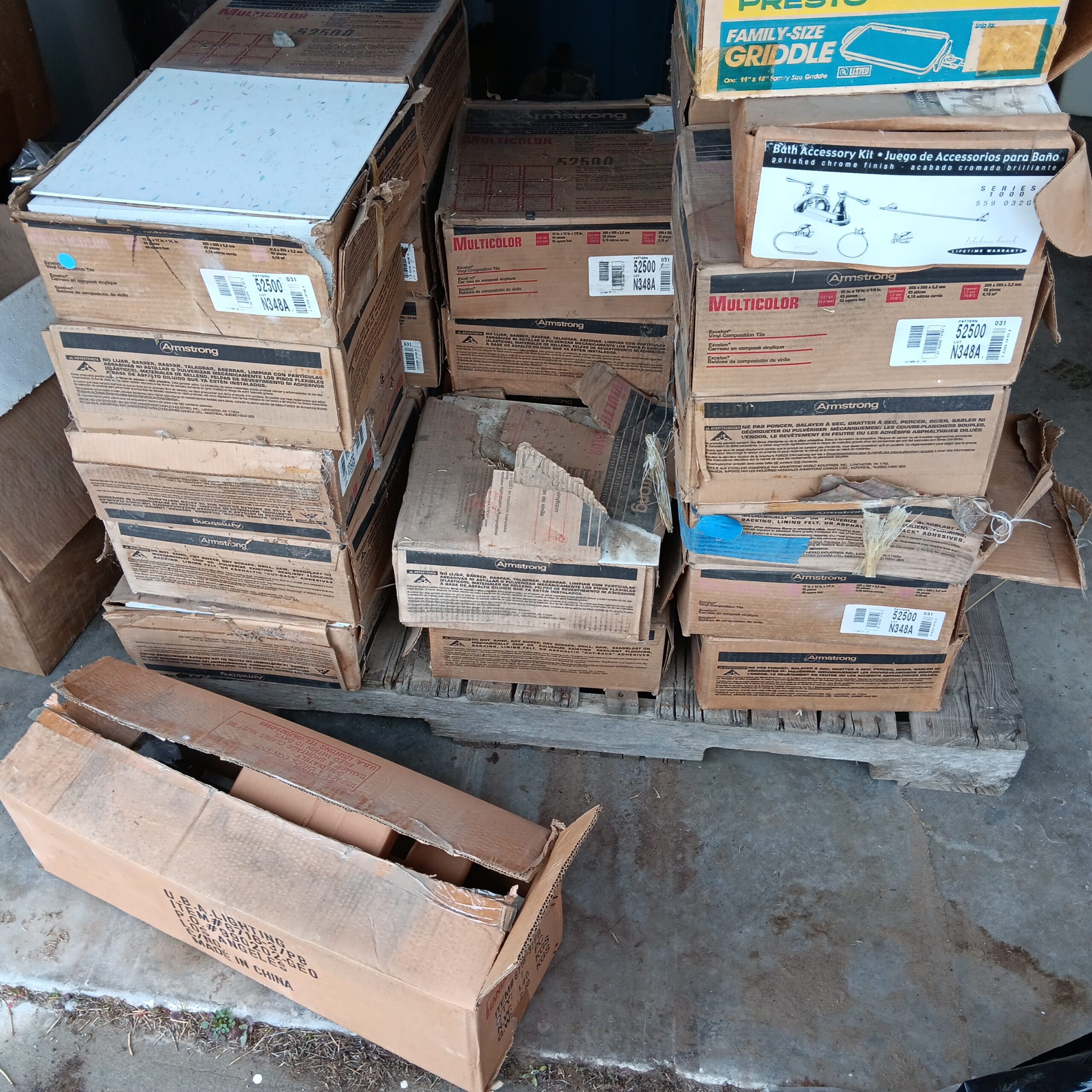 Inside the garage , taking up most of the space we have a lot of new in box lighting fixtures. Brass and glass are back baby! Also , a pallet of linoleum square tiles. Perfect for any professional or home use.